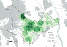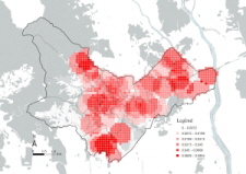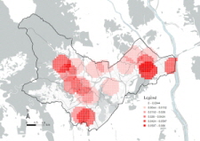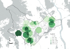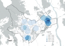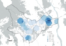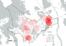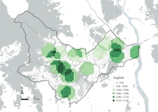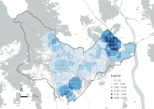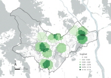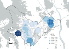 2단계에서는 1단계에서 계산된 공급 대비 수요 비율 Rj의 합을 통해 각 지역의 최종 공간 접근성 값을 산출한다. 즉, 2단계에서는 각 수요 중심지의 버퍼 반경 내에 위치한 시설에 대해 1단계 지수(Rj)를 합산하여 Ai 값을 계산한다(Eq. 2).