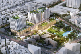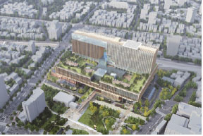Proposal E adopts an open healing platform that connects the city plaza with the hospital interior through a transparent facade. The roof garden has a high proportion of vegetation and high ecological density, and the public spaces are extended to the upper levels of the hospital, naturally dissolving the boundary between the interior and exterior. In particular, the concept of “a breathing hospital” was achieved by combining the horizontal and vertical ventilation roots and the transparent facade.
